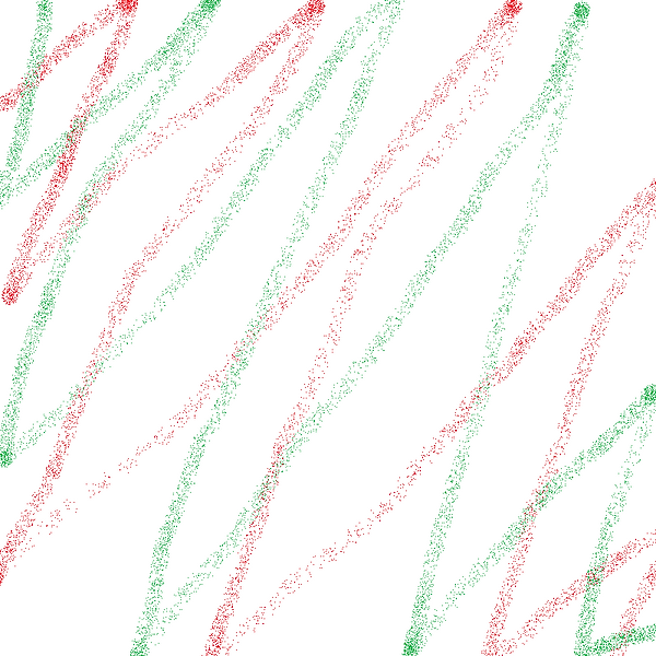 The first step is to create an image that controls a vector field. A potential vector field is generated from an image in which red pixels push brushes outward and green pixels pull them inward; these pixels act as the field’s sources. The image PField.png shown below was created in Windows Paint in about four minutes using the airbrush. You do not need to be precise, because MCP automatically selects an optimal number of sources from your image to balance detail and performance (see the built‑in manual for more information).